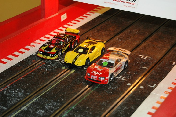 A GARA terminata possiamo dire che ci siamo divertiti molllto.... Soprattutto a vedere i tipi di slot che hanno gareggiato ieri allo Slot Club Arci di Roma. Infatti Daniele ha corso con una Ferrari 360 e con 96 giri totali è arrivato primo. Yuri con una Ascari 2° class. Lamberto con una Supra 3° class. Tommaso con una Nissan 350 4° class. Franco con una Supra 5° class. Pier Giorgio con una Ford Capri 6° class. Canzio con una Ford Capri 7° class. Massimo con una Ascari 8° class. E Enzo prima ha iniziato con una Supra poi è passato alla Porsche 997 9° class. Poteva essere la serata di Massimo con una velocissima Ascari gialla ben preparata dal figlio Daniele ma per un grano della corona sgranato ha perso 4/5 giri in terza manche e così come sempre si è dovuto accontentare del penultimo posto. E ho pagato i cornetti per gli affamati come potete vedere dalle foto.