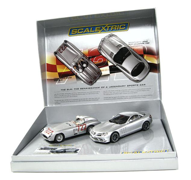 Scalextri immette sul mercato un cofanetto commemotativo "MIlle miglia 1955" con due modelli una è la mitica Mercedes benz 300 slr e l'altro modello è la Mercedes Maclaren 722.