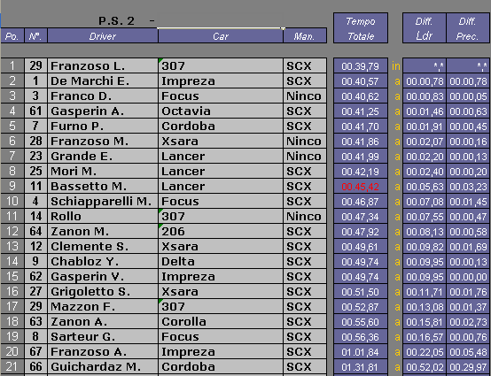 Mentre non giungono nuove a questa redazione, vogio spendere due parole sulla modalità di esecuzione delle prove speciali. Al fine di ottimizzare i tempi delle gare, i piloti vengono dividi in gruppi di 4, che rispecchiano la classifica del campionato. I primi 4 piloti percorrono la prima speciale e poi passano alla seconda, il secondo gruppo parte dalla prima e così via fino al termine delle 3 prove speciali, dove si fa il riordino e stilando la classifica provvisoria. In base a quest'ultima si formano i gruppi da 4 piloti e si riparte per altre tre prove speciali.