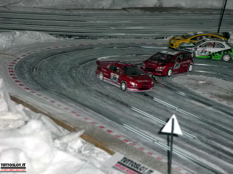 Per tutti le stesse gomme. Tutti con PRS rigate da neve. Si dimostrano da subito buone gomme, garantendo una valida aderenza sul fondo più liscio (pista Scalextric) per di più innevato. Ma i miracoli non fanno parte della filosofia PRS, pertanto traversiiiii!!!