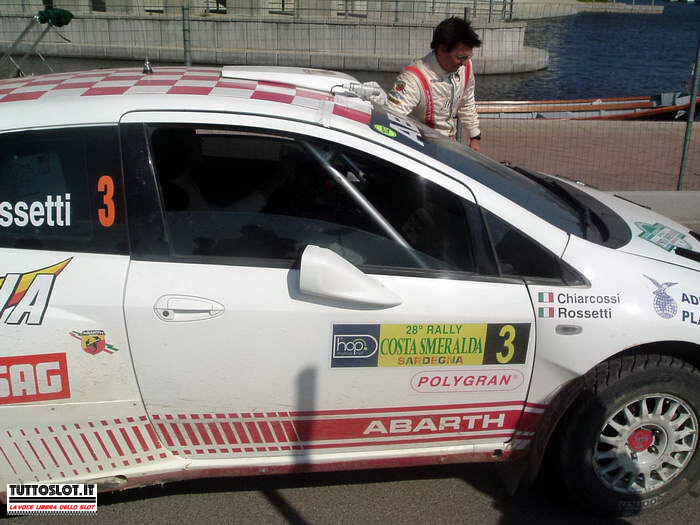 Pur intenti a seguire le nostre prove speciali, nulla ci sfuggiva di quanto accadeva nel rally Costa Smeralda e non ci è potuto sfuggire l'evento che ha decretato la resa di Rossetti con l'Abarth rande Punto, a favore di Andreucci e la sua Peugeot 207 S2000. In questa sequenza di foto l'Abarth di Rossetti, prima parcheggiata con le ruote in posizione "innaturale", poi aiutata dal suo navigatore, Chiarcossi, a farla arrivare in parco assistenza, dove il gruppo dei meccanici Abarth, trepidanti, l'attendevano per trascinarla letteralemente all'interno dell'officina per il ripristino. La penalità pagata per il ritardo ha permesso ad Andreucci di trovarsi ad amministrare un vantaggio diventato di oltre un minuto e mezzo.