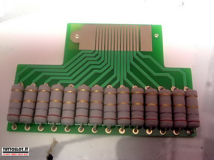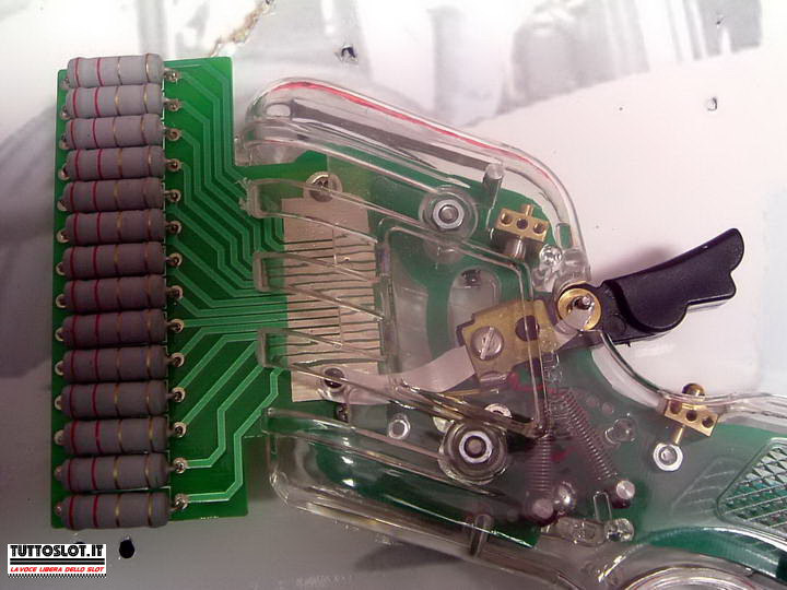 Appena pronta la pista provvedo personalmente alla prima presa di contatto con i nuovi controller 20121. Mi impressiona molto il grilletto. Corsa breve e molto "tenera". Sento subito un buon feeling con la corsa del grilletto che, con la resistenza da 25.2 mi permette un controllo ottimale delle Ferrari F430 Challenge di MBSLot. Il dosaggio del gas è molto "fine" e mi permette un controllo totale della curva di coppia del motore. La cosa alla quale non mi trovo è la frenata. Troppo decisa. La macchina si ferma quasi in curva. Pazienza, vuol dire che adatterò la guida e cercherò di fare quello che mi piace di più: frenare dentro la curva. Dopo alcuni passaggi riesco a prendere confidenza con il tipo di guida e riesco a staccare dentro la curva e subito, dando tre colpetti di acceleratore, controllare la leggera sbandata del modello e uscire velocissimo dalla curva. Dieci giri e riecco i tempi soliti che faccio registrare con gli altri pulsanti che uso, con il vantaggio che in caso di necessità la frenata c'è, eccome!! Ottimo anche il sistema di fine corsa del grilletto. Con due semplici brugole riesci a modificarne la corsa a vantaggio della personalizzazione e quindi del controllo. Per me va bene così. Provo la "pasticca" con la resistenza da 30.8. Non riesco a trovare l'ottimale condizione di guida. La corsa del grilletto si è fatta corta. La macchina inizia a prendere gas da poco meno di metà corsa in su. La telefonata a Marco Ballardini chiarisce tutto. Il test è stato fatto con la tensione di 9 Volt, che è la tensione alla quale faccio girare i neofiti, e tale resistenza non ha sufficiente tensione. Rimetto corrente a 12 Volt e tutto torna come prima.