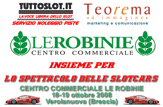 Sabato 18 e Domenica 19 ottobre, presso il Centro commerciale "Le robinie" di Verolanuova Brescia, Tuttoslot sarà presente con la sua pista e lo spettacolo delle slotcars.
