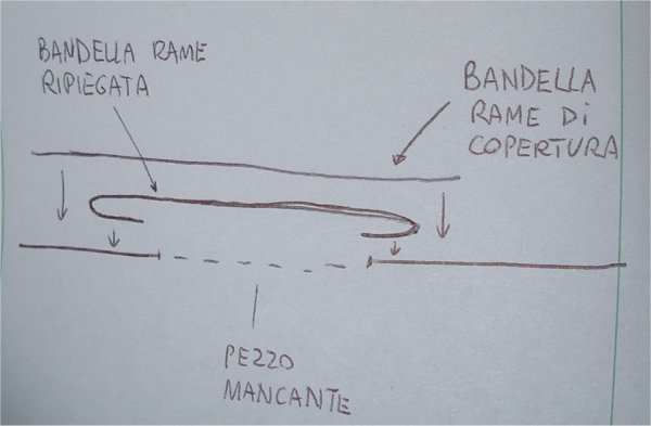 si prende un pezzo di bandella in rame adesiva la si piega in modo che le due estremità ripiegate tocchino le due parti di bandella da collegare, poi con un altro pezzo di bandella si ricopre il tutto in modo da fissare e non far notare nulla.