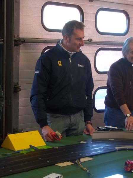 Nel frattempo si riapre anche la pista slot, avevamo ancora due gruppi da intrattenere... Mentre Senio dava consigli su come si guida una slot, il sottoscritto faceva da commissario (credo di essere andato in pari con tutte le volte che mi sono fatto sostituire...) ci chiedavamo che fine avesse fatto Simone... e dopo un pò lo vediamo tornare a piedi con il casco in mano. Era il suo turno sulla 360 quando un guasto all'ABS gli ha fatto vivere il brivido di un lungo alla San Donato...