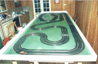 Come preventivamente progettata, montate la pista sulla tavola, tenendo in considerazione lo spazio che dovranno occupare le prese dei pulsanti. Ora dobbiamo considerare i punti dove dare corrente al tracciato che, per una distribuzione ottimale della tensione, dovranno essere almeno due per corsia, e farci dei fori per il passaggio dei fili elettrici. Oltre a questo dovremmo considerare dove sarà lo start per i fori di passaggio fili di un eventuale sistema di cronometraggio automatico. I vari pezzi della pista andranno fissati al tavolo uno ad uno con delle viti da legno, sfruttando, nel caso di una pista Polistil, gli appositi anelli di fissaggio. Nel fissare i vari pezzi occorre accertarsi che i contatti siano perfettamente puliti e che non vi siano perdite di tensione. L'ideale sarebbe di avere a disposizione un tester che ci renderà quest'ultima verifica molto più semplice. In casi estremi è possibile inserire alcuni fili di rame (meglio se bianco: non si ossida) tra i contatti che ci renderanno il passaggio di corrente più fluido. Al termine dovremmo avere la nostra bella pista in posizione stabile sulla tavola. Come in questa foto.