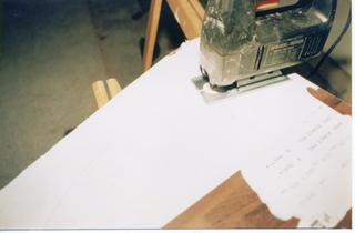 Una volta preparata la maschera, si passa alla fase del taglio del legno. Per farlo utilizziamo un seghetto alternativo. Fissiamo con del nastro da carroziere la maschera al legno e, seguendo le linee tracciate, tagliamolo. facendo i cordoli con questo procedimento si ha anche la possibilità di riempire zone esterne alla pista o spazi attigui della stessa