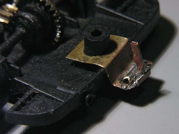 Cominciamo dall'intervento sulla macchina: il gancio di traino è realizzato in lamierino di ottone spesso 0,5 mm. forato per incastrarsi attorno alla sede della vite e sagomato in modo da passare tra il telaio e la carrozzeria.