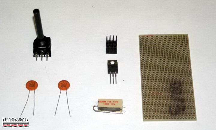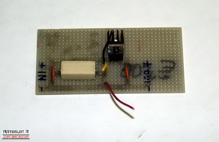 - riponete il circuito in una scatolina delle dimensioni adatte a contenerlo, fissatelo e con del filo elettrico collegate i piedini IN a due boccole poste su un lato della scatola che serviranno a collegare i fili che escono dal vostro alimentatore al circuito; ripetete l’operazione per collegare i piedini OUT ad altre due boccole poste sempre sulla scatola che serviranno a collegare l’uscita del circuito alla presa dell’alimentazione della vostra pista.